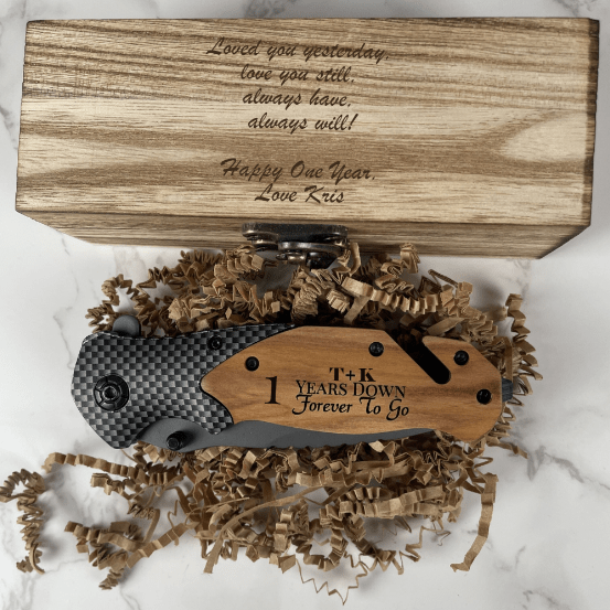 My husband opened his package and I saw his eyes get big. He opened his personalized box and saw the knife. I finally bot the perfect gift. Clean work and the personalized touches with his name and a little message made it even better. Thank you for taking pride in your work.
