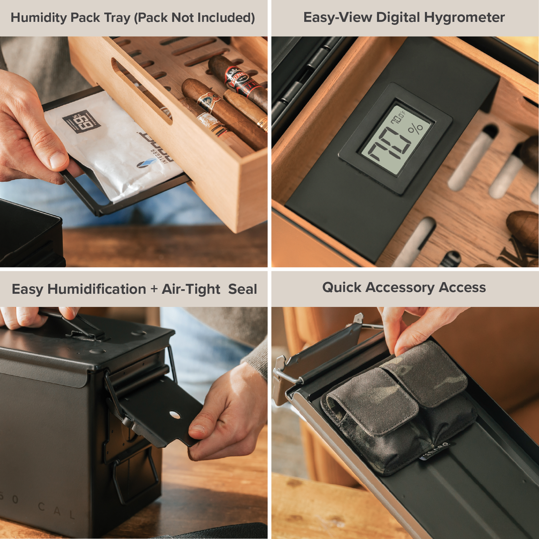 The Smoke Can 50 Cal takes cigar storage to battle-ready levels. Built from a genuine M2A1 ammo can and finished in sleek black, this humidor fuses military toughness with refined Spanish cedar craftsmanship. Whether gifting it to a groomsman, honoring a veteran, or elevating your own cigar game, it’s a fortress for your finest sticks.