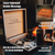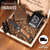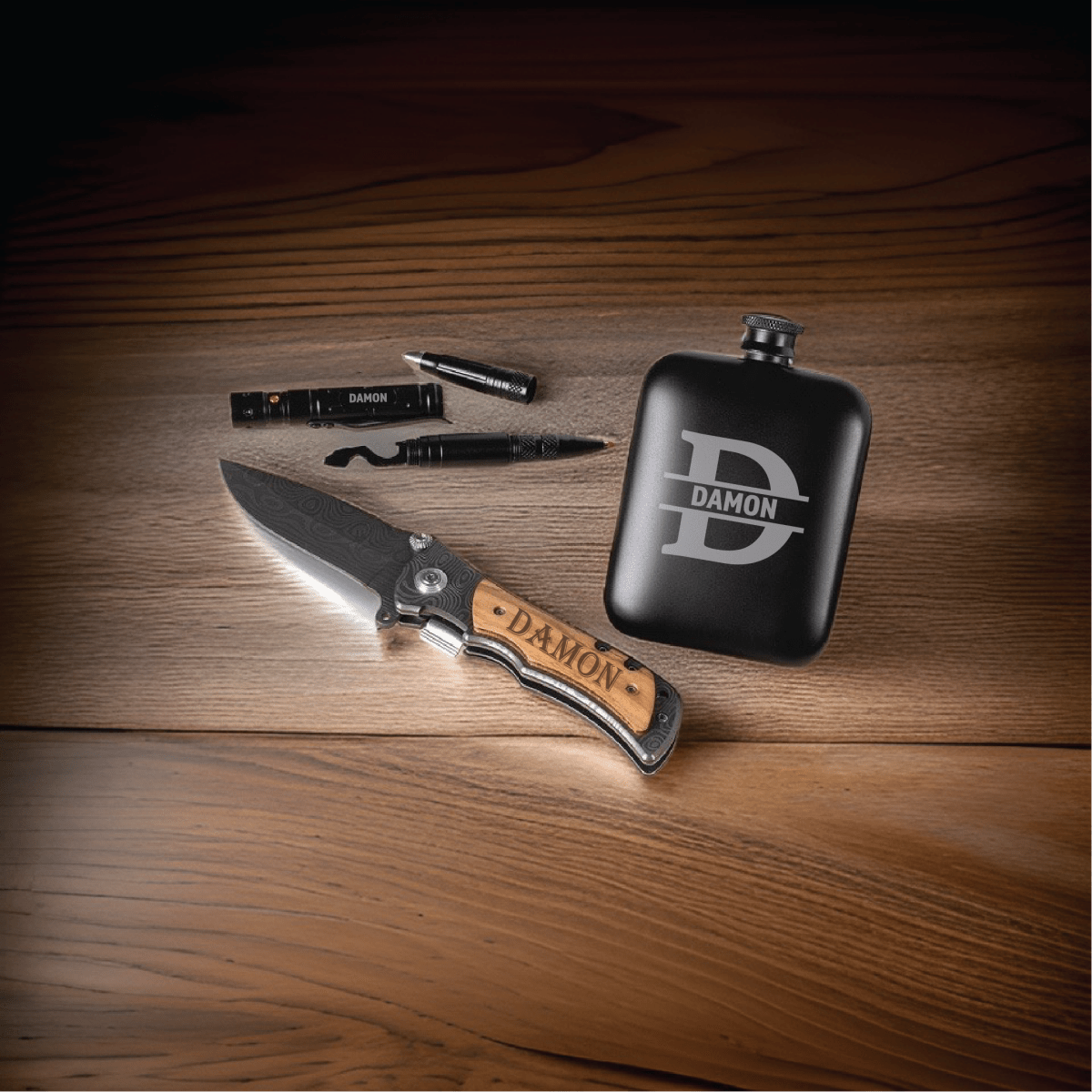 The gift box includes a selection of high-quality products such as a luxurious personalized bi-fold wallet, a slick engraved Damascus-style knife, a premium hip flask, and a useful tactical pen. All this with a special reminder of how much he means to you.