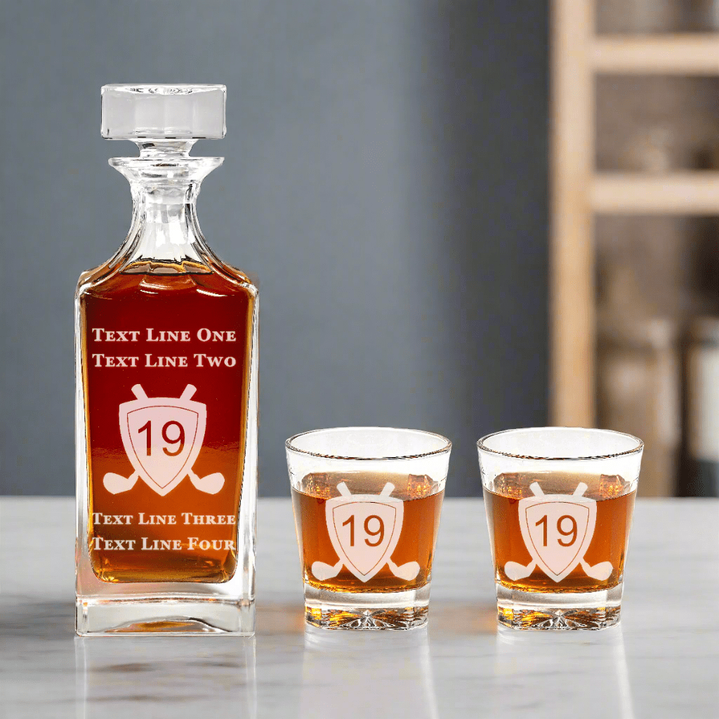 Celebrate your love for golf and fine spirits with the 19th Hole Decanter Set, a striking blend of sophistication and personalization. Featuring a crossed golf clubs design with "19" engraved in the middle, this decanter set is perfect for golf enthusiasts who enjoy winding down after a great round.
