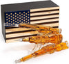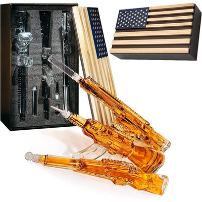 A unique custom made gun whiskey decanter set with a wall mounted flag rack to hold three of your favorite gun decanters. Our AR15, AK47, and Rifle Whiskey Decanter Set is the perfect way to enjoy a nice drink while showing your patriotism. This decanter set is for all the guns and whiskey lovers out there. This one of a kind hand-blown glass set features 3 classic 1000ml military style gun decanters you can fill with your favorite whiskey or bourbon!