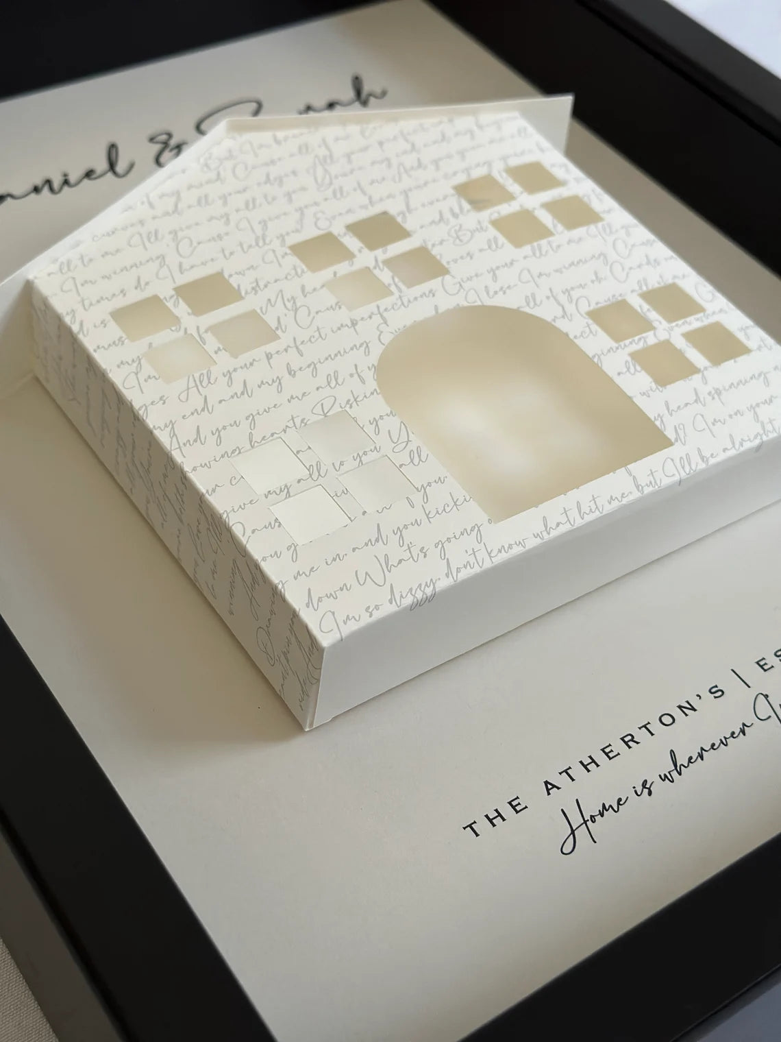 Inside the shadow box contains a custom 3D house with your 1st dance song lyrics, wedding vows or any other message you'd like printed on it. The house is made from an off-white cardstock and the background options are either light gray or kraft brown with black writing. Under the house is the last name of the couple, the wedding year and the quote "Home is wherever I'm with you". Any of this can be customized, so feel free to send a message!