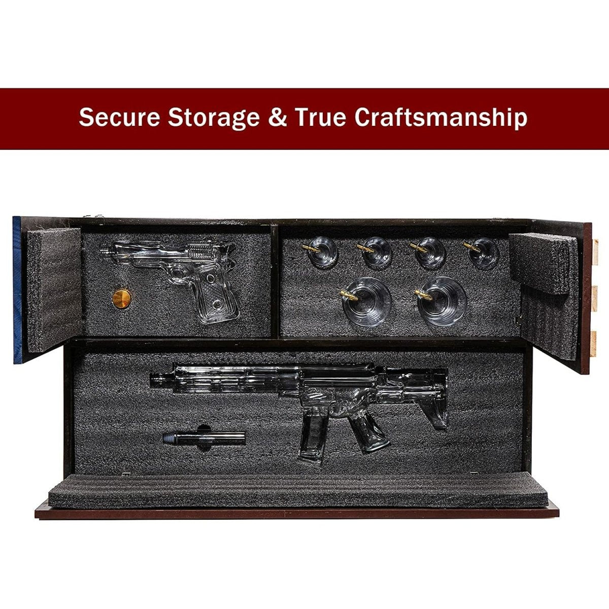 This striking whiskey decanter Set is sure to turn heads. The unique design features a pistol decanter, AR15 decanter, 4 bullet shot glasses, and two bullet whiskey glasses. Refresh your home bar with this sleek, pistol-shaped glass decanter. Crafted of fine clear borosilicate glass, each pistol decanter features a bubble knob. Standing approximately 9 inches tall, and the ar15 decanter at 24" long, this set is sure to become a conversation starter at your next gathering.