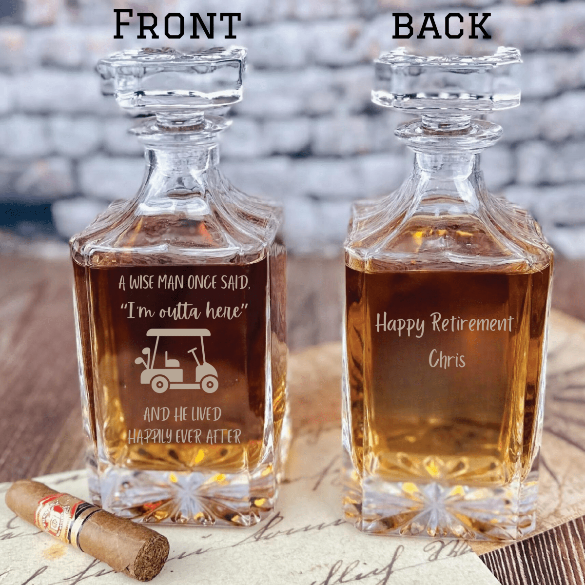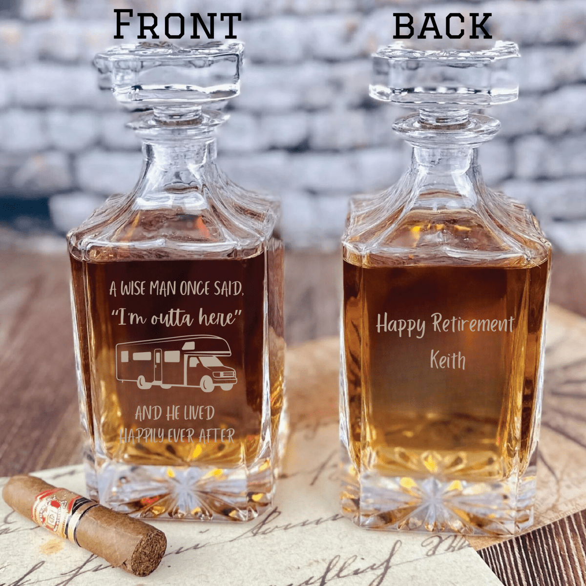 Toast to new adventures with this personalized and humorous "Cruising Into Retirement" Decanter. Whether it's a relaxing sail or a cross-country RV journey, this stylish decanter captures the essence of retirement with a fun twist. The front is engraved with the witty quote: "A wise man once said, 'I'm outta here,' and he lived happily ever after." The back is fully customizable with a personalized "Happy Retirement" message and the retiree's name. It's a thoughtful, meaningful gift that turns a retirement toast into a memorable celebration of new beginnings.