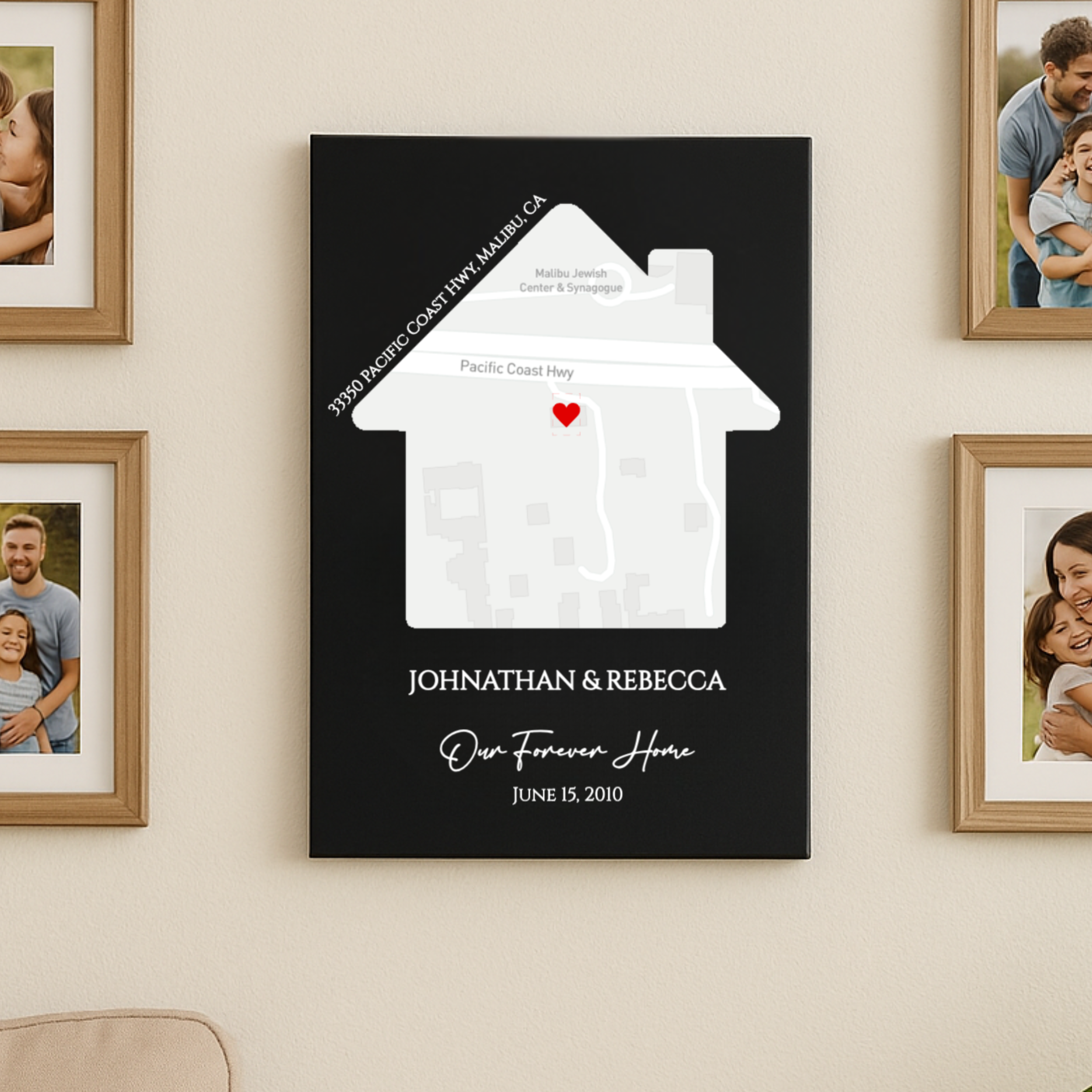 Crafted from sleek black leatherette with precision white engraving, this house-shaped map includes a heart marking your exact location. Customize it with your names, a meaningful phrase, and a special date — perfect for celebrating a move-in day, engagement, or anniversary. It’s a daily reminder of love, roots, and the memories you’ve created side by side.