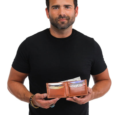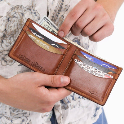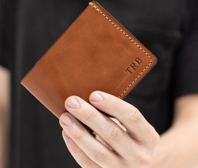 This Custom Leather Bifold Wallet is crafted from genuine full grain leather and made in the USA. These make a perfect gift for father's day, a boyfriend gift, or as a groomsmen gift. Personalize this wallet with up to 3 characters on the front, bottom right.