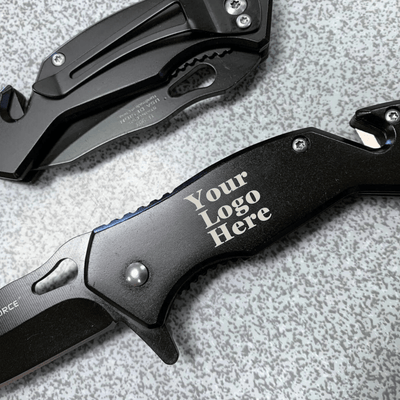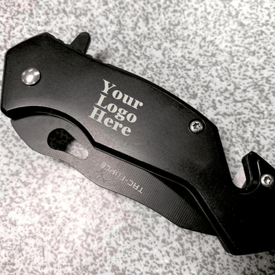 The perfect knife for the perfect company event. A knife that has what he wants: sharp and strong blade, seat belt cutter and clip to carry on a belt or pocket. The 3.75 inch handle feels good in his hand while its black color makes it more masculine. Make your company logo pop at any event with this Custom Logo Tactical Blade!
