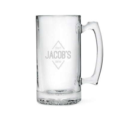 What do guys love more than beer...well besides that, Nothing! Your guy will be all smiles with this extra-large mug in his hands.  Made in classic bar style, the extra-large size means not only are they durable, but they easily hold two beers in one glass. Best part is larger mug means fewer trips to the fridge. Pilsner, lager, or ale, this personalized extra large stein with its solid glass handle, will handle them all.