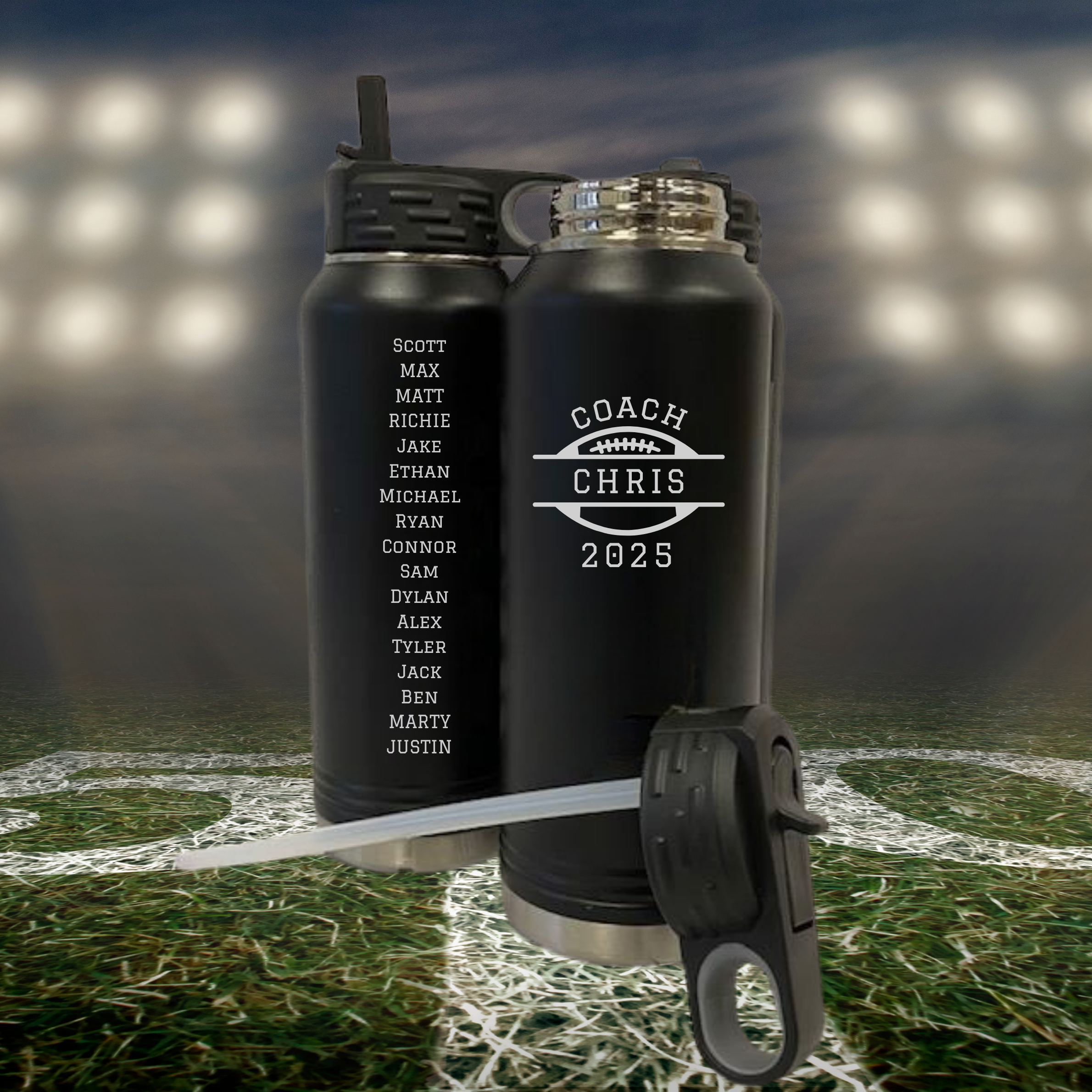Cheers to the football coach who has led the team through victories, challenges, and unforgettable moments on the field! This custom 32oz water bottle isn’t just practical—it’s a meaningful symbol of gratitude for their dedication and hard work. The sleek, laser-engraved design adds a personal touch, featuring their title and name alongside a football-inspired motif, making it a keepsake they’ll cherish for years to come.