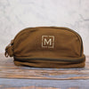 Heavyweight cotton canvas, has 2 zippered compartments, is plastic lined, and with dual compartments. Size is 11.9 x 7 x 6.1 inches; 11.2 ounces.