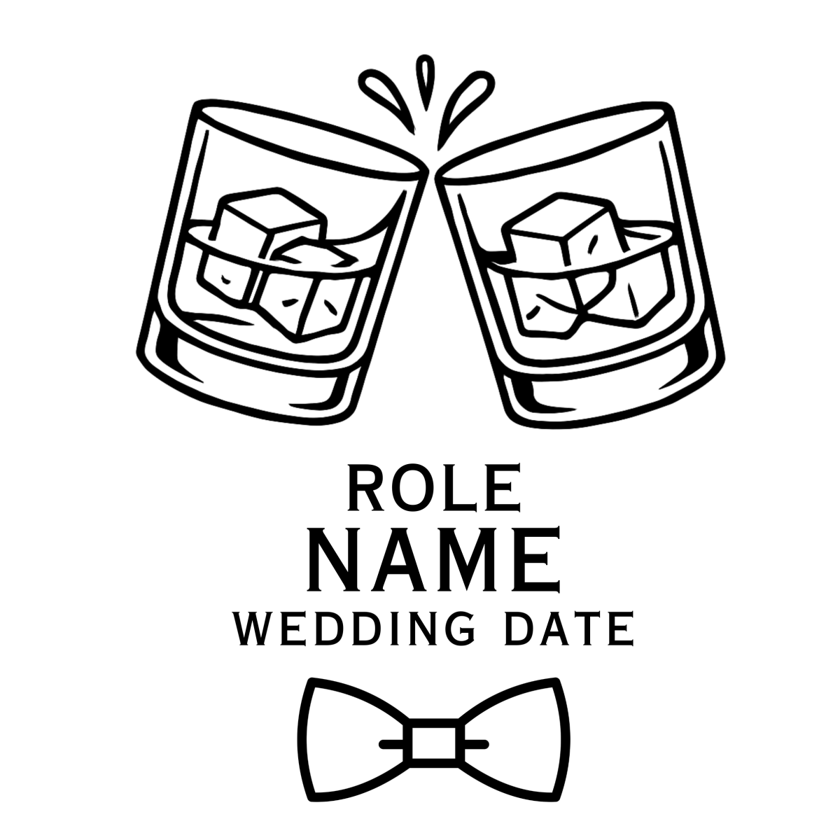 Front: Two whiskey glasses clinking above personalized name, role, and wedding date, with a bowtie underneath