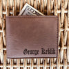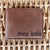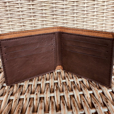 Buckeroo is a personalized brown leatherette wallet that can be personalized with up to 25 characters The wallet measures 4 1/2" x 3 1/2" and is 1/8" thick.