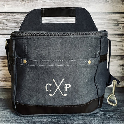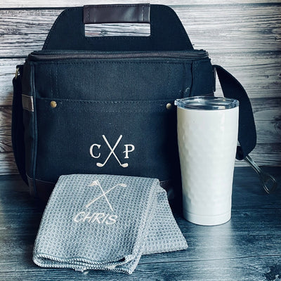 Do you like to drink while golfing? Oh that's right, everyone does! Well if you want to do it in style then this is the set for you. We all know your swing is all in the hips, but to get you loosened up it is all about what you are sipping on! The cooler not only comes personalized with your initials on it but it will fit 10-14 bottles/cans of your favorite beverage. The dimpled tumbler that looks just like your golf ball fits so perfectly in your hand and holds 20 ounces of liquid. The tumbler is also triple vacuum insulated which means its built to keep your drink cold from one hole to another and will fit perfectly in any cart cup holder. The slide top on the lid will help prevent you from spilling that essential swing oil when things get a little bumpy. But Hey! If you forget and spill a little, then that is why we included the microfiber waffle towel in this set! Wipe your hands, balls and/or clubs with this absorbable towel. The tri-fold towel also comes personalized with your name on it and has a hook to secure on your bag!
