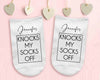 Personalized fun custom socks for Valentine's Day are great for him or her. Let them know you knock their socks off with a pair of these personalized socks. Just provide a first name and we'll add it to this design and print it on a pair of our cotton no-show socks. A memorable and personalized way to say "I love you". The design is printed on the top of the socks, when worn the designs can be seen on the top of the foot.