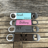 This bottle opener is wrapped in genuine leather material to add style to your man's collection. This bottle opener is small enough to take everywhere and big enough to get those bottles opened. To personalize this gift, add your personalization to the text box above.