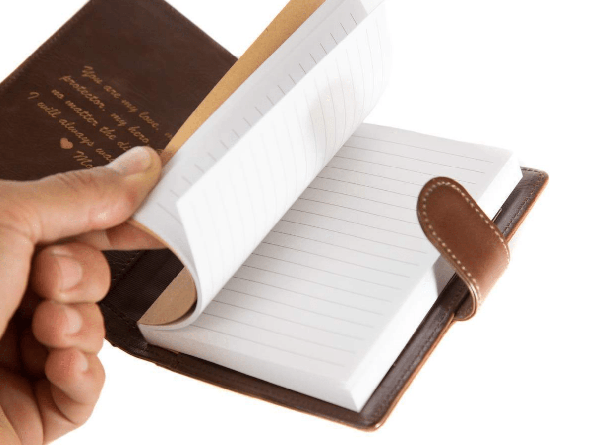 This journal is made from split leather so it is guaranteed to last a long time. It also comes with 200 pages of lined paper, which is a lot that can fit into that small journal. He will carry this wherever he goes and have you right by his side.