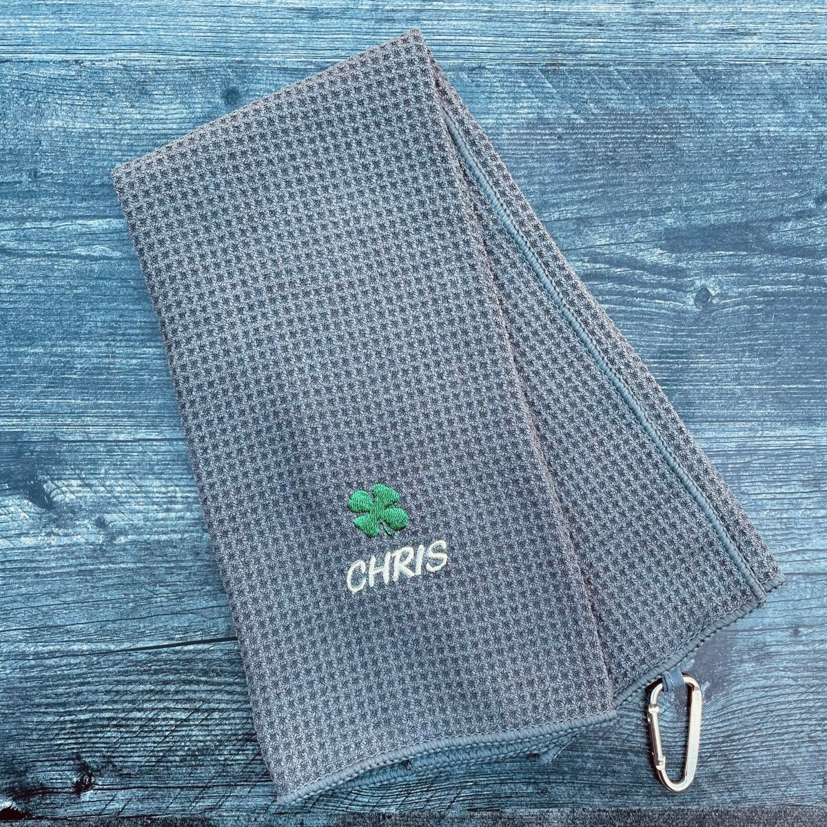 The personalized cooler comes with an attached bottle opener so you can pop the top off your favorite beverage to help you hit bombs all over the course. The personalized microfiber waffle towel will keep your hands, clubs, and balls clean before every shot. And last but certainly not least, the four-leafed clover designed putter cover made of soft leather and lined with soft fleece will bring you all the luck you need where it matters most - the GREENS!
