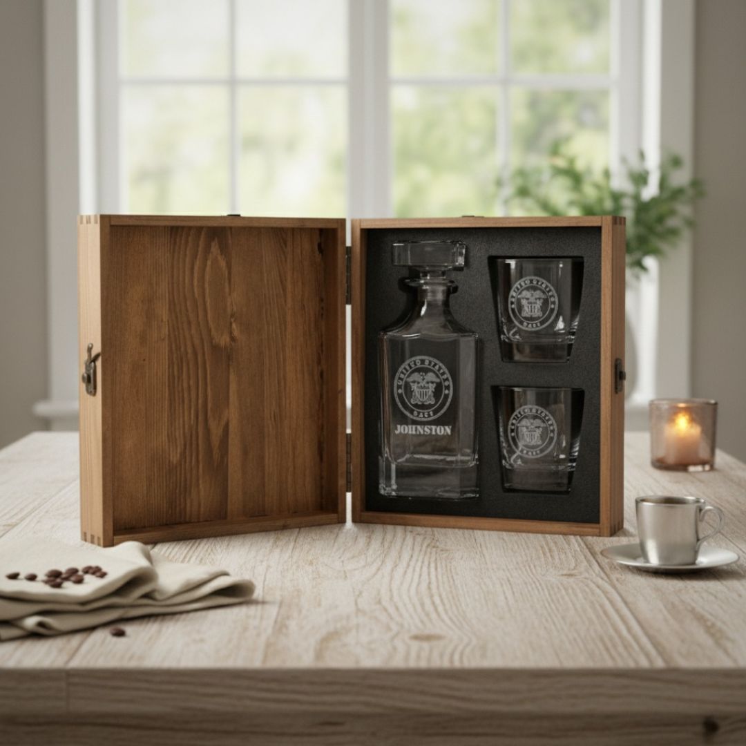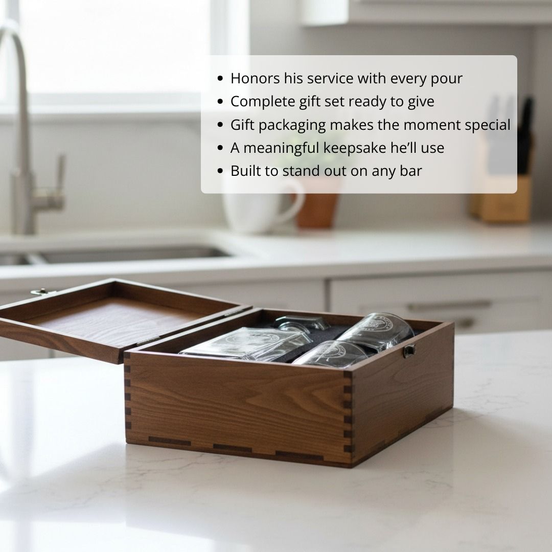 Crafted for both beauty and durability, the premium glass decanter holds 27 oz (800 ml) of his favorite bourbon, whiskey, or scotch, while the prism-shaped 9 oz glasses offer an elevated drinking experience. Nestled in a custom pine wood gift box with custom engraving and foam insert, this set becomes a lasting reminder of duty, honor, and the bond between giver and recipient.