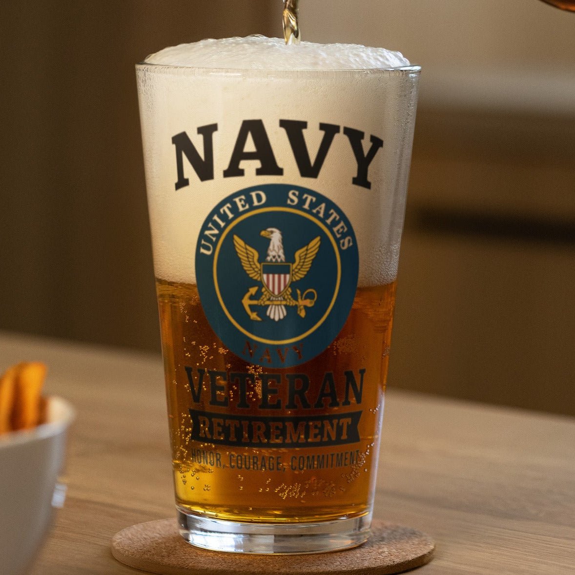 Celebrate the Navy retirement milestone with this beautifully crafted Navy Retirement Pint Glass. Featuring the iconic Navy emblem and bold "HONOR, COURAGE, COMMITMENT" text, this 16 oz pint glass is the perfect way to honor a retiring Navy veteran. Whether you’re enjoying a cold drink or mixing cocktails, this glass is a high-quality addition to any glassware collection. A thoughtful Navy retirement gift that combines functionality and sentimentality.