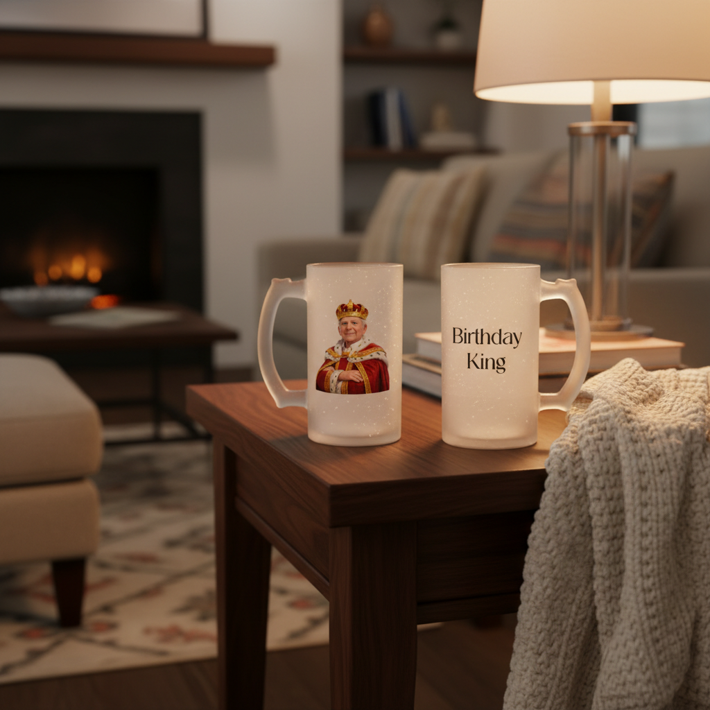 Turn him into the star of the show with the Birthday King Frosted Beer Mug, the ultimate gift for the "big of the party". Simply upload a photo, and our AI will generate him in a regal king costume, making it the perfect way to celebrate a major milestone or a first legal beer. This head-turning mug will have everyone asking where they can get one, quickly becoming his favorite piece of glassware.