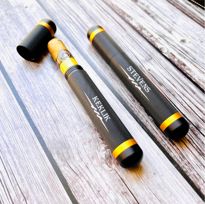 The gift box, cigar travel case and lighter can be personalized with his name. Follow the example below when adding his information. You can also add a custom role that will be engraved on top of the box under his name.