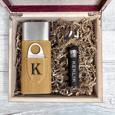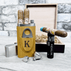 Personalized Cigar Travel Case with Built-in Flask: Crafted to store and protect up to two cigars, this brown travel case features a built-in 3 oz flask, allowing for a seamless pairing of a favorite drink with a cherished smoke. The case can be personalized with an initial, adding a unique touch.
