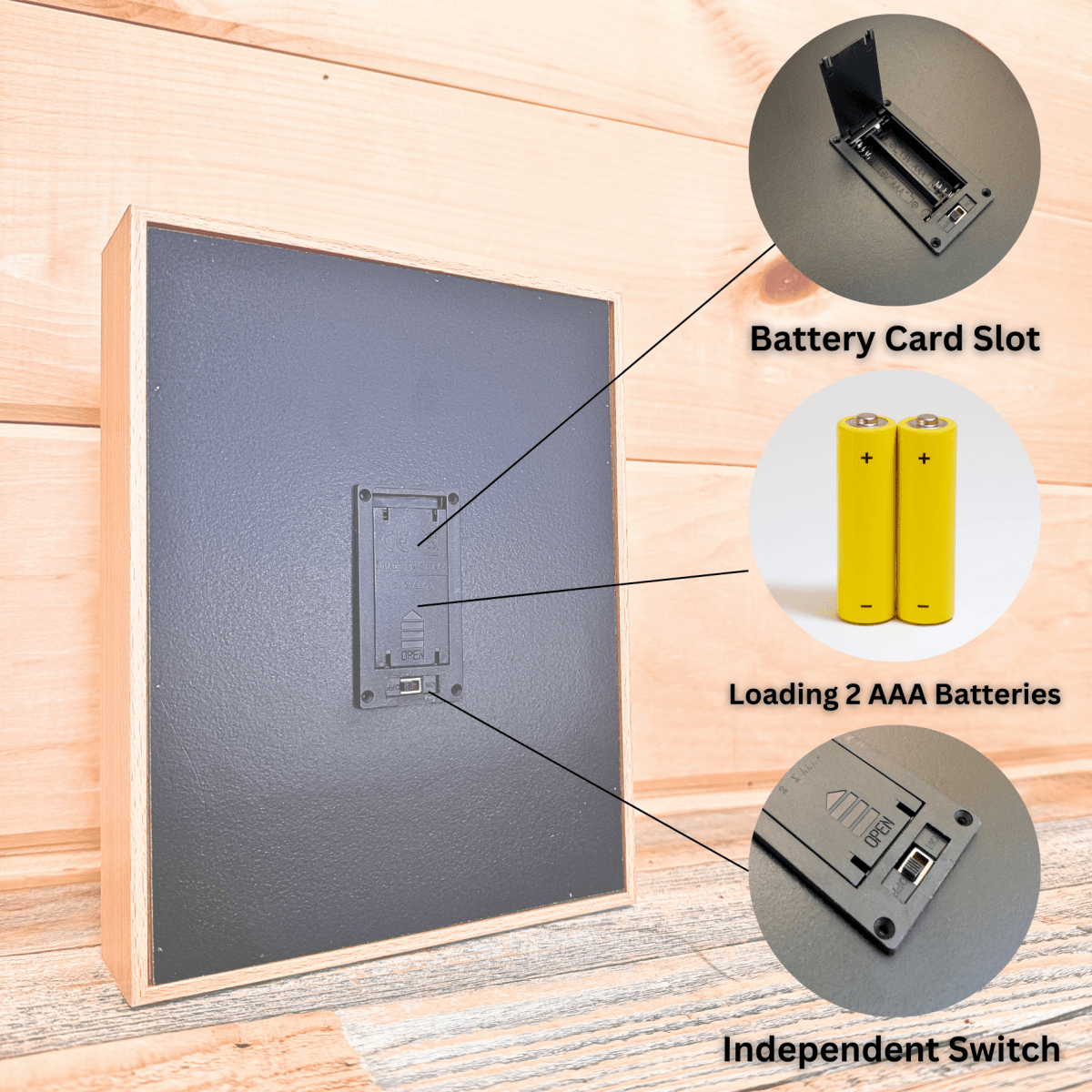 The frame requires 2 AAA batteries (not included) and has an independent switch for easy use.