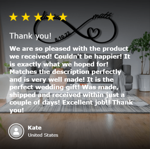 We are so pleased with the product we received! Couldn't be happier! It is exactly what we hoped for! Matches the description perfectly and is very well made! It is the perfect wedding gift! Was made, shipped and received within just a couple of days! Excellent job!! Thank you!