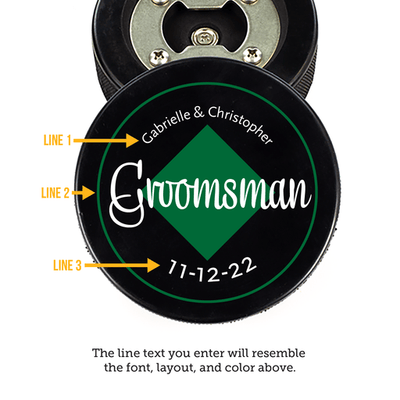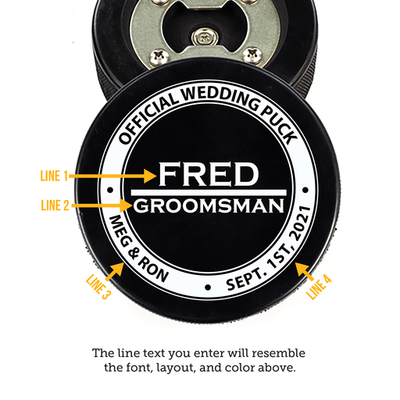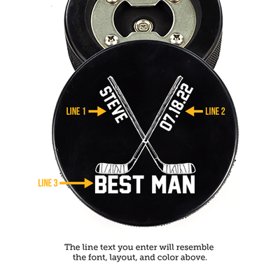 Introducing the "Puckin' Perfect Wedding Opener," the ideal bottle opener for any hockey-loving couple tying the knot. Crafted from an authentic hockey puck, this unique piece doubles as a functional bottle opener and a memorable keepsake for your wedding party.