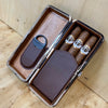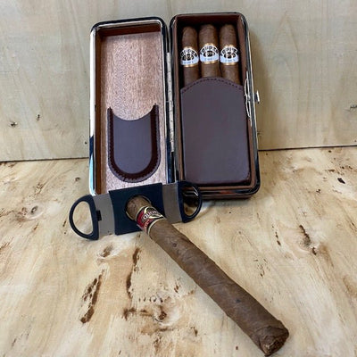 Gift your cigar loving mover and shaker this to go cigar carrying case. This travel-sized cigar case comes with everything your guy needs for a good night with a good smoke. Allow your aficionado the comfort of knowing his favorite stogies are safely stashed. Comes with a Guillotine Cutter so he is all set to enjoy his smooth smokes wherever he may be.