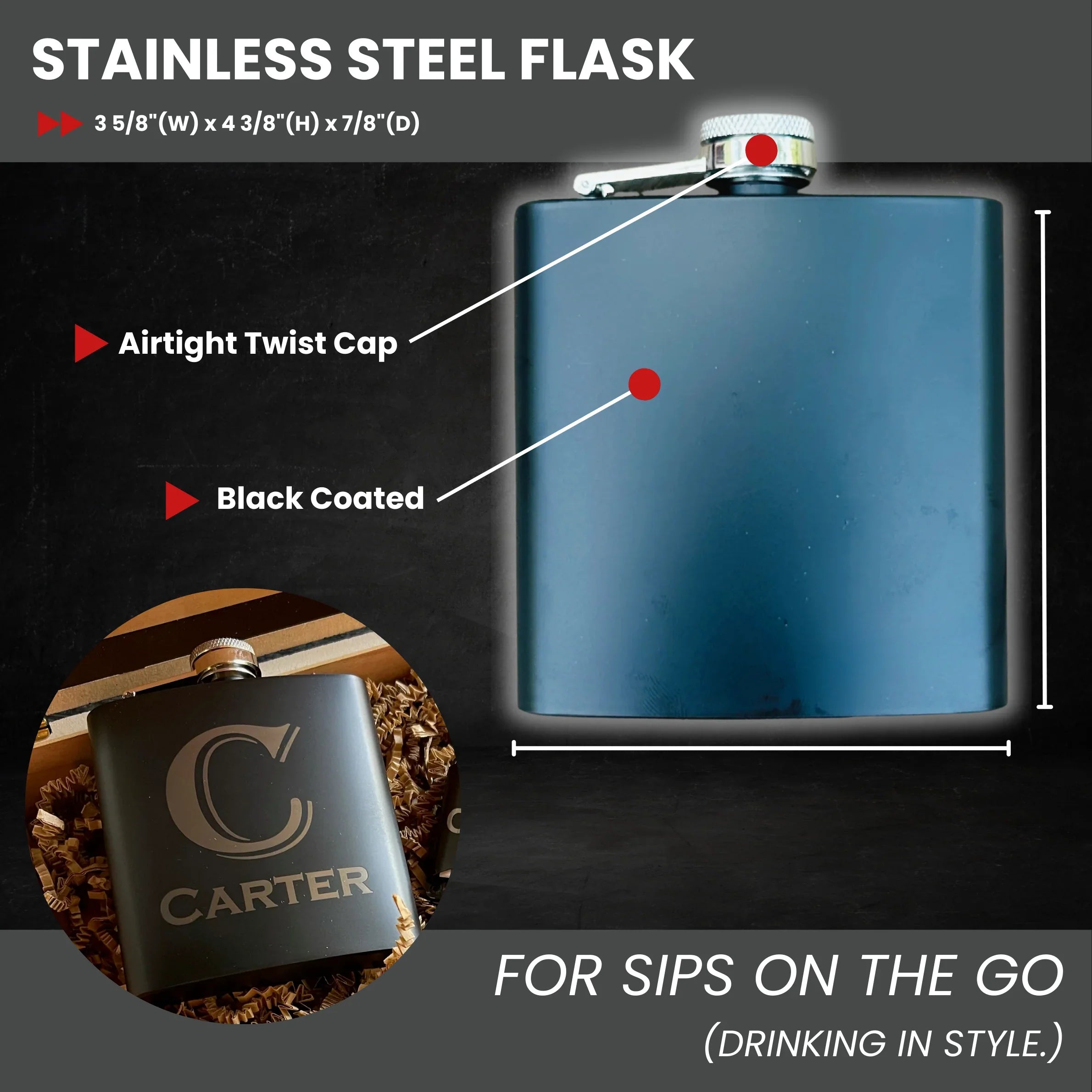 Flask: 3.5" x 3.75" x 0.75", holds 6 oz, black matte finish