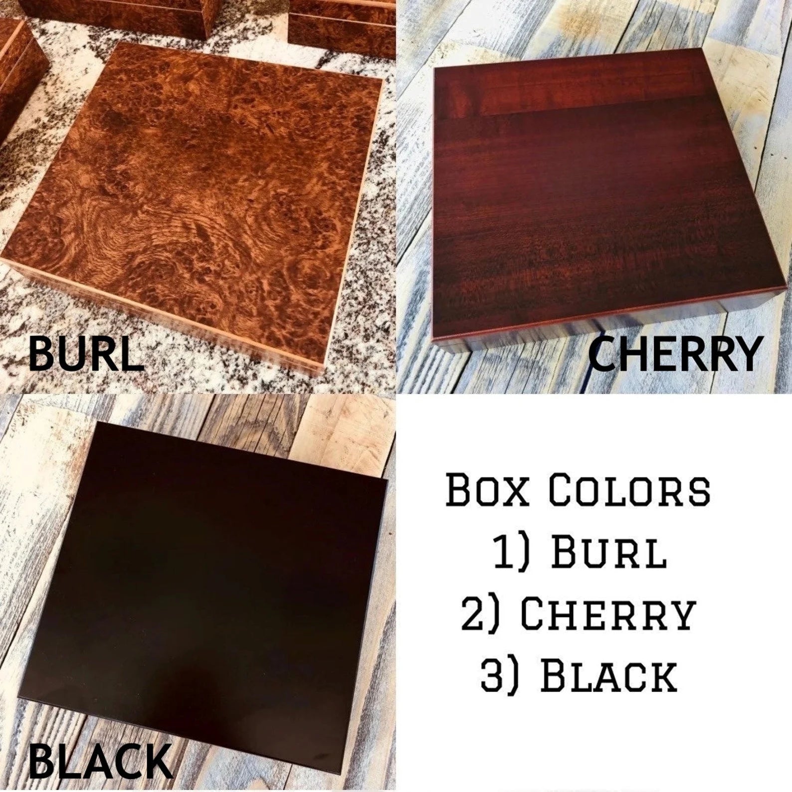 Wooden Box: Black, cherry, or burl finish; lined with Spanish cedar; 9" x 8.5" x 2.25"; includes humidifier; fits 20 cigars