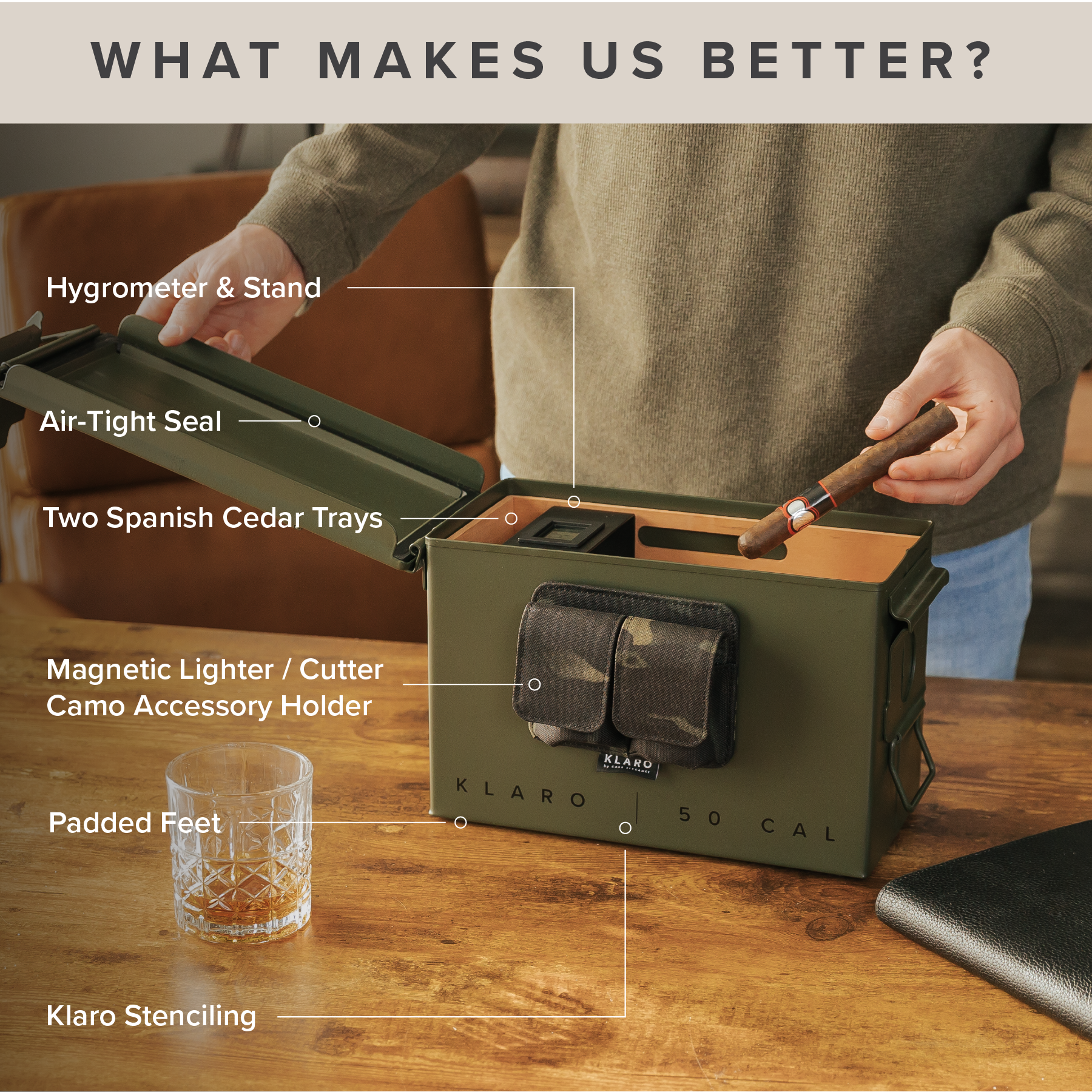 The Smoke Can 50 Cal Green isn’t just a humidor—it’s a mission-ready fortress for your finest cigars. Crafted from a genuine M2A1 ammo can and finished in classic military green, this humidor delivers unmatched toughness with refined Spanish cedar craftsmanship. Whether gifting it to a groomsman, honoring a veteran, or adding to your own collection, it’s built to protect and impress.