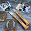 Comes with engraved spatula and fork with baseball bat handles.