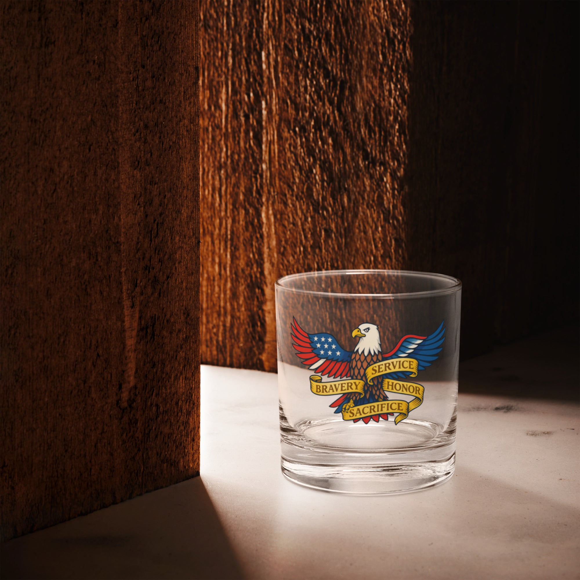 For the man who believes in strength, service, and savoring the moment—this USA Bravery Rocks Glass makes every sip meaningful. Featuring a commanding American eagle wrapped in banners of Bravery, Service, Honor, and Sacrifice, it’s the perfect tribute to the values he lives by. Whether he’s raising a toast to a hero, winding down after a long day, or hosting a well-earned gathering, this glass is sure to spark pride and admiration.