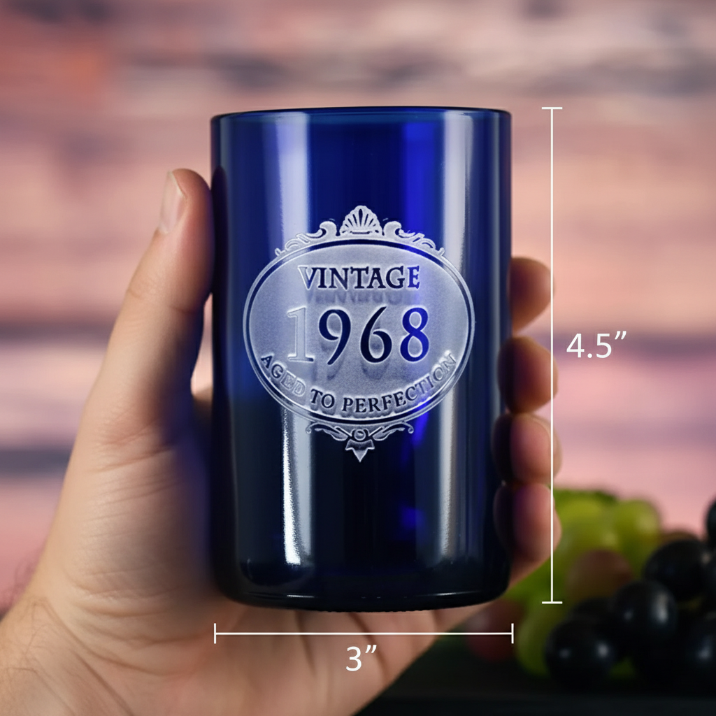 The engraved Vintage Year glass tumbler is a great birthday gift for men and women. These reclaimed wine bottle tumblers are recycled from cobalt blue riesling wine bottles and meticulously sand-carved by hand with your monogram, personalization, or your company logo. Create a beautiful table with our colored glassware or give a unique gift to that person who has everything. Our wine bottle drinking glasses hold approximately 12 oz and measure 4.5" high by 3" wide. The lip of the repurposed wine bottle has been beautifully and carefully polished to a smooth edge for drinking. The recycled glass tumbler is dishwasher safe.