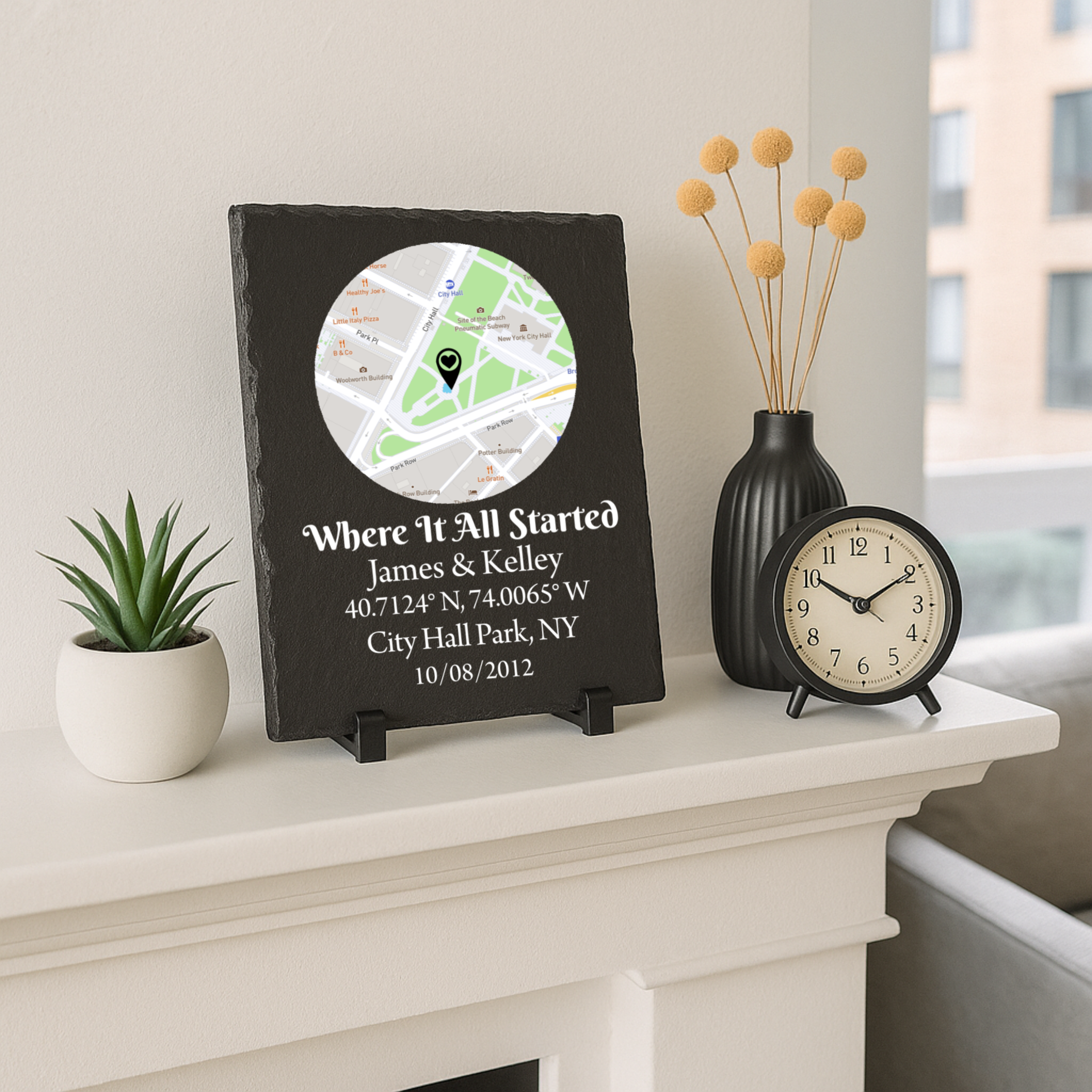 Made from solid slate stone and printed with rich detail, this personalized piece is as lasting as your love story. Whether it lives on his desk, nightstand, or in your shared space, it’s a daily reminder of how far you’ve come — and how it all started with one unforgettable place.