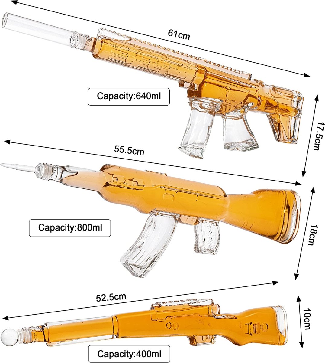 A unique custom made gun whiskey decanter set with a wall mounted flag rack to hold three of your favorite gun decanters. Our AR15, AK47, and Rifle Whiskey Decanter Set is the perfect way to enjoy a nice drink while showing your patriotism. This decanter set is for all the guns and whiskey lovers out there. This one of a kind hand-blown glass set features 3 classic 1000ml military style gun decanters you can fill with your favorite whiskey or bourbon!