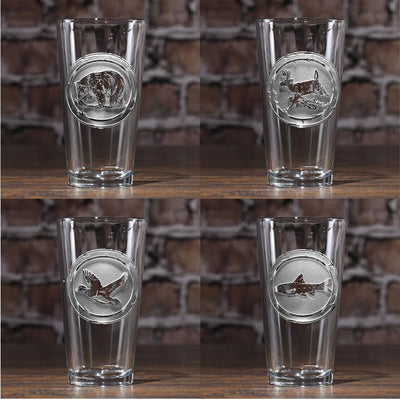 Wildlife Animals Etched Glassware Set. Engraved nature lover pint glass drinking glass set includes bear, deer, fish and duck and is a great gift idea for the man or woman who loves animals, hunting, fishing and the great outdoors. Deeply carved using our sand carving technique, each pub glass is meticulously custom made to order making it the perfect gift for those seeking unique gift ideas for men and women alike.