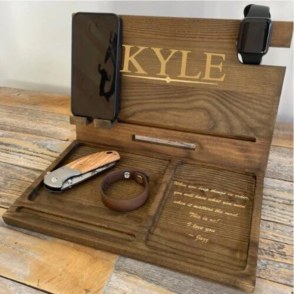 Streamline his space with the Personalized Wooden Charging Dock, a functional yet sentimental gift perfect for organizing daily essentials. Crafted from natural wood and custom-engraved with your personal message, this docking station combines practicality with a heartfelt touch, making it a standout addition to his desk, nightstand, or office.